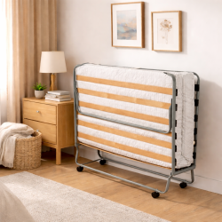 Le Lit Pliant 120 Mémoire de Forme offre un confort supérieur pour un couchage d’appoint double. Avec ses dimensions 120 x 190 cm, il est idéal pour accueillir un couple ou proposer un espace de couchage spacieux et qualitatif à vos invités. Sa structure en acier diamètre 25 mm garantit robustesse et stabilité. Le sommier est composé de 17 lattes en bouleau, assurant un excellent maintien et une répartition homogène du poids pour un soutien optimal. Le matelas, d’une épaisseur totale de 10 cm, associe une base en mousse polyuréthane haute résilience et une couche supérieure en mousse à mémoire de forme. Cette technologie épouse les courbes du corps, réduit les points de pression et améliore le confort de couchage. Il est habillé d’un coutil doux et respirant, apportant une finition soignée et agréable au toucher. La hauteur du sol au sommet du matelas est de 39 cm, facilitant l’installation et le lever. Pratique au quotidien, il se déplie rapidement et se replie facilement après utilisation. Ses 4 roulettes intégrées permettent un déplacement simple et fluide. Une fois plié, il reste compact et se range aisément dans une chambre, un bureau ou un espace réduit, tout en conservant un niveau de confort proche d’un véritable lit.