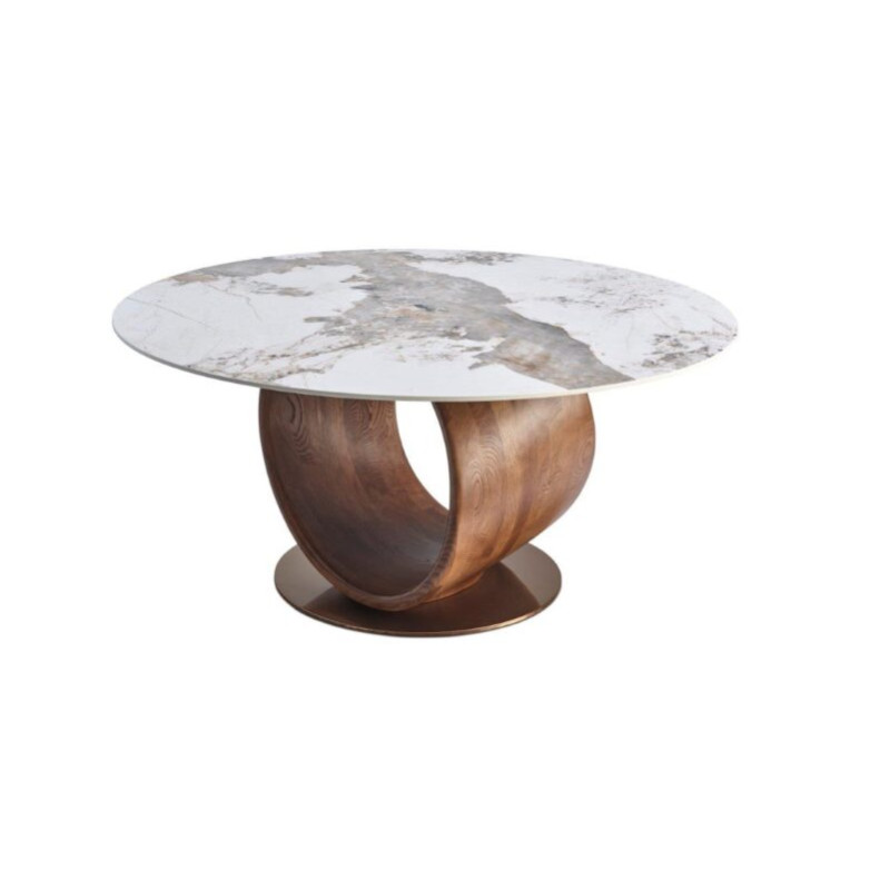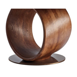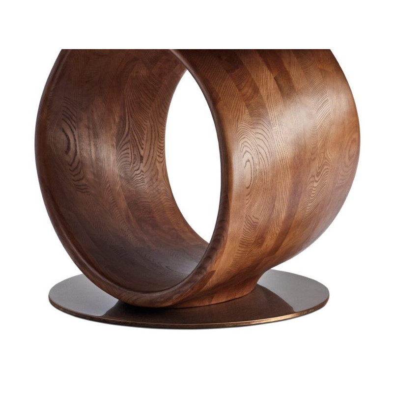 Son piètement central en frêne massif coloris brun apporte chaleur et caractère à l’ensemble. La structure du pied assure une excellente stabilité tout en libérant l’espace pour les jambes.
